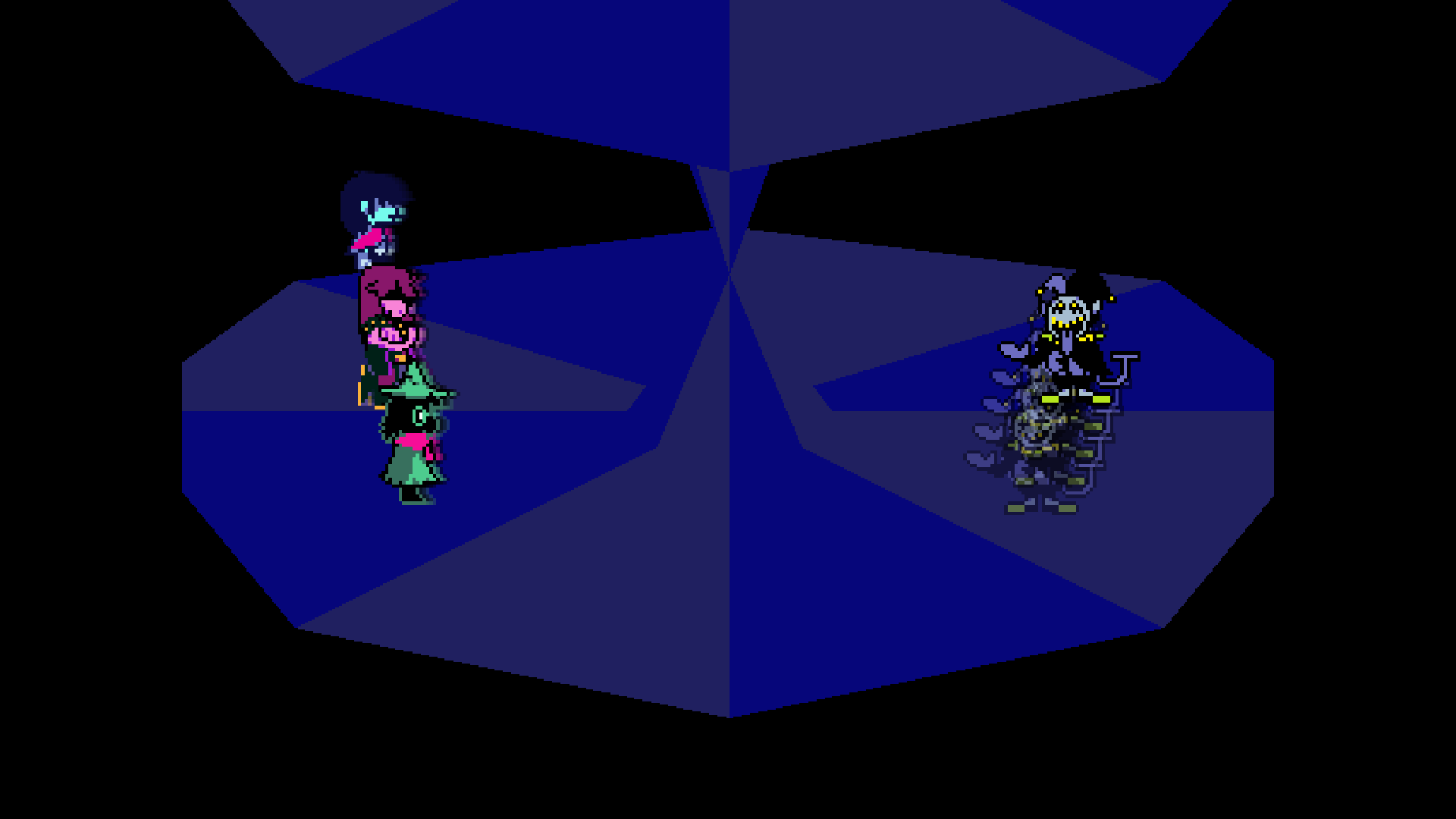 ignore his fuckass expression on this screenshot he's actually so unserious it makes me laugh and also i have not really enjoyed his fight as it is meant to be chaotic after all... don't get me wrong i think that his fight is actually sick including the 3D modeled setting and the chaotic motive revolving around it (haha funny pun) also the fight music is a banger and jevil is actually a really interesting character to me and i want to analyze him more. i didn't want to be stuck forever on him like i was with the titan and asgore when playing undertale. i kind of suck when it comes to fights in these games too. HOWEVER!!!!! i do plan on beating spamton NEO in chapter 2!!! very excited for this actually i am mainly looking forward for that fight..:]